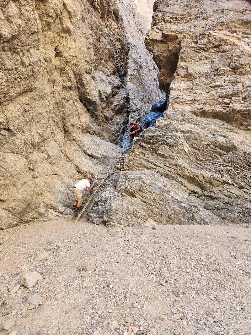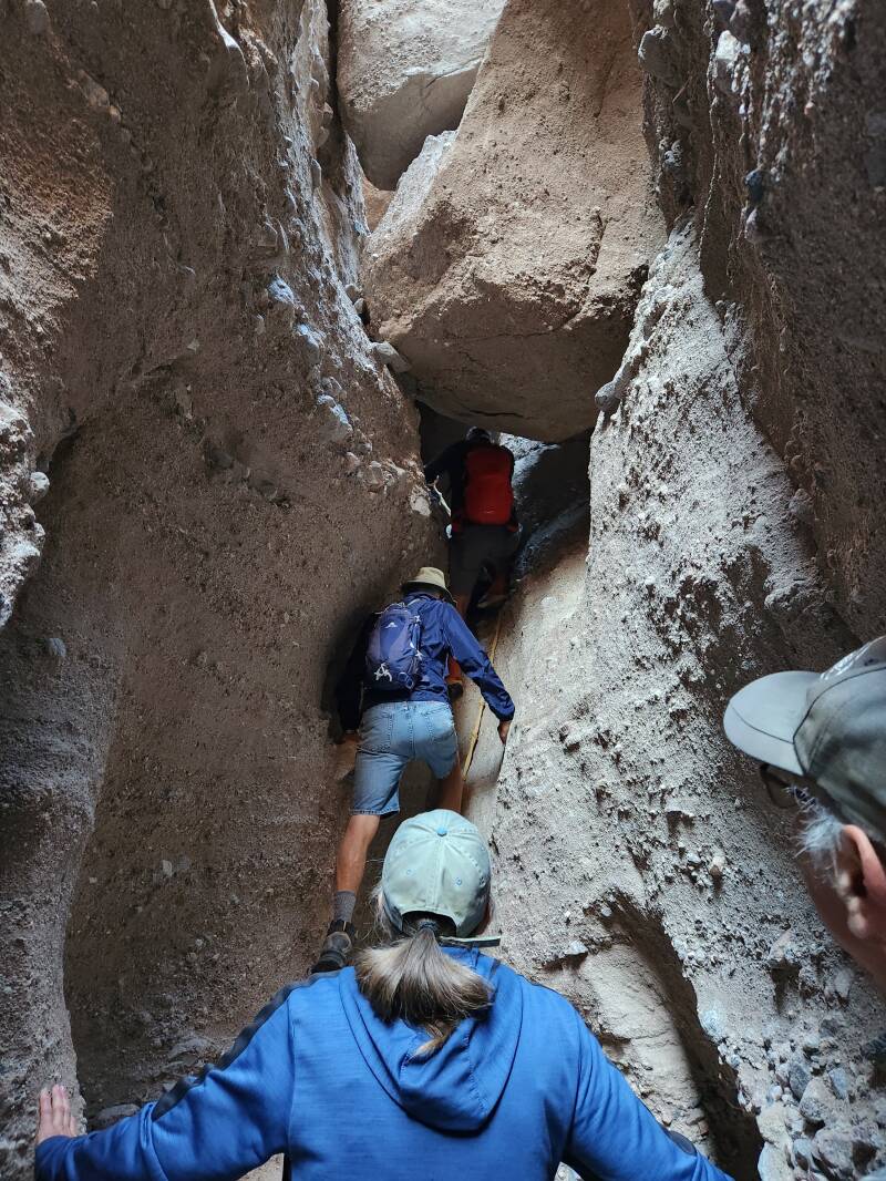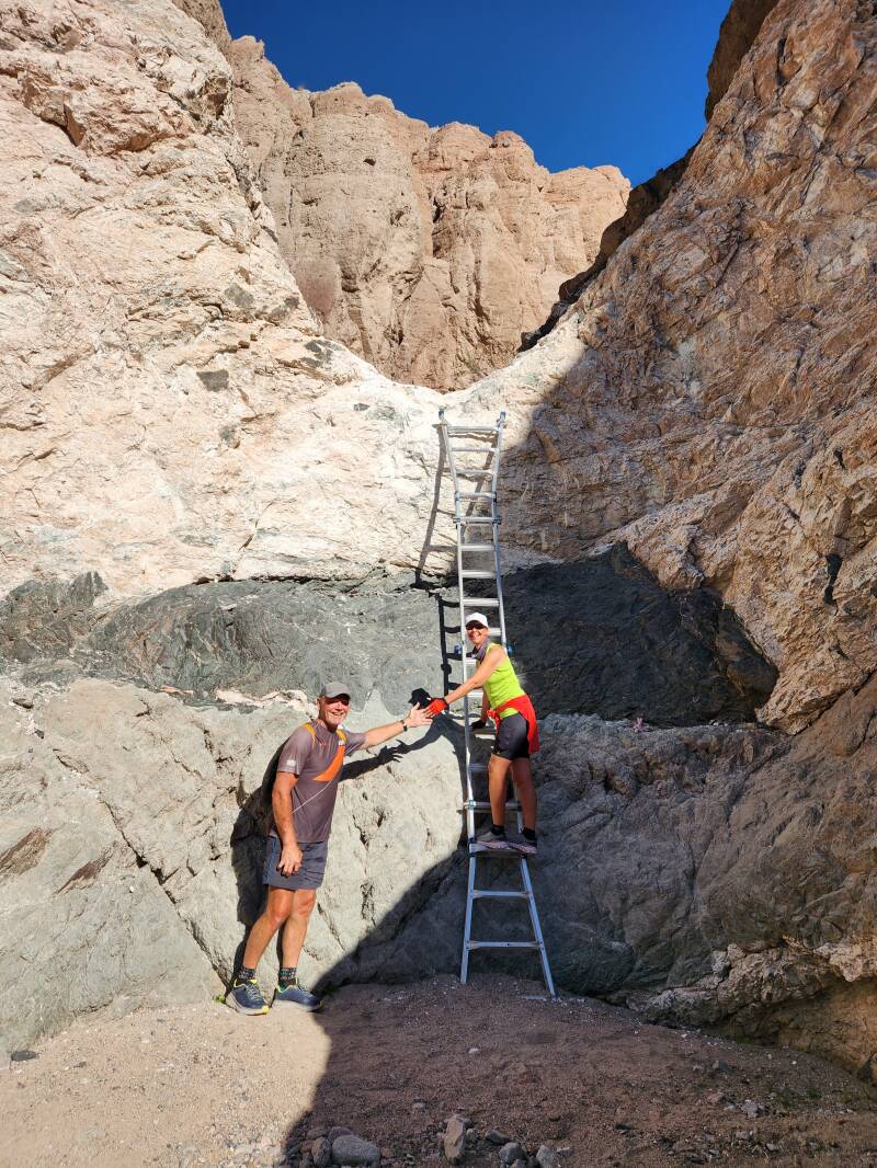 Day 167, today ( Monday), was my birthday so we had the opportunity to do something special. We joined the FOY hiking group to head into the Painted Mountains not far from FOY to do a slot canyon hike. Think ladders, ropes, squeezes and scrambles through the desert. Nine of us headed off into the canyon where we negotiated 10km of trail where the consequences of a missed foot were dire! It was great fun and a great way to spend our last day in the desert. The photos capture a little of some of the terrain we traversed.