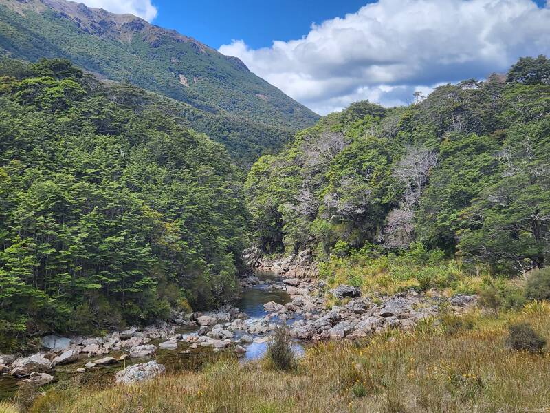 We had lunch at the hut before returning back down the valley. Our new boots and shoes did well and while we were both a little tired on return, overall a great start for us getting used to tramping again. I have nicked mum's walking poles for Gordon and I think they made a huge difference. He shuffles a lot with his right leg when walking and his right arm does not swing due to his Parkinsons. The walking poles improved his shuffle no end and forced him to swing his arm. He did really well.