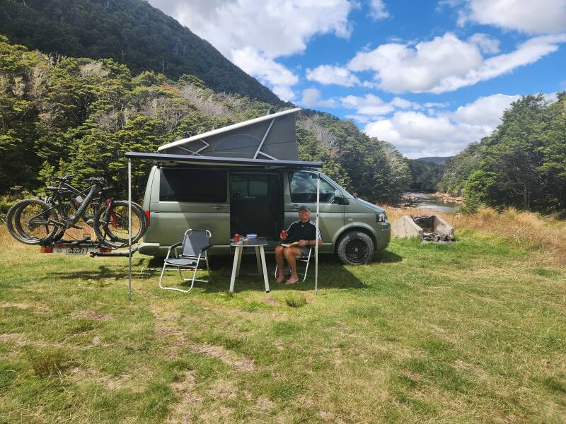 We've had a quiet afternoon at camp, enjoying the peace and quiet. There are surprisingly few people here so it is very pleasant. We broke out the BBQ for dinner and managed to mostly avoid the sandflies. They have become more voracious as the evening has worn on, so we are now hiding in the van. We have a large insect screen across the sliding door so can have that up and have the door open which is nice.