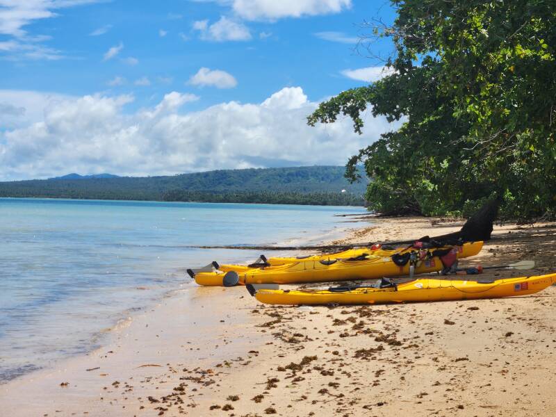 After a good half an hour watching the turtles, we headed onto another sandy beach where Jessie climbed a coconut tree and proceeded to shake down our lunchtime snack. Fresh coconut accompanied by banana crisps and chocolate crackers. Another swim out in the bay where we rafted the kayaks up and watched the turtles around us before a casual paddle back toward the mangrove River. The turtles are impossible to photograph! The tide was out so a short portage was required to get us back upstream. We finished the paddle with a swim in a fresh water pond and a late lunch served on the deck at Vai Villas. More fresh coconut, pawpaw, guava, chicken, rice, bread, salad and more. A delicious feast to finish an incredible day.