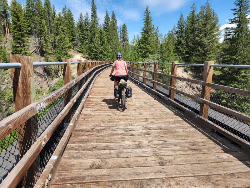 After taking a day to rest and recover in Prineton, it was time to ride again and what an excellent day it was. Finally off road for the entire day on the Kettle Valley Rail Trail or KVR. The KVR stretches 639km from Hope to Castlegar following a disused railway line (sound familiar?). Unfortunately the section from Hope to Princeton is closed which is why we had to take Highway 3. While parts of the KVR are well formed, the surface leaves a lot to be desired in places. Today for example, was all on fine sandy gravel. This made it very slow but with our wider tires we really enjoyed it. We have 2.6 on the front and 2.4 on the rear. We let a little air out and had no troubles at all with the ride (except that it was still really slow). The trail rose up from the valley at about 2% for the entire day so slow and steady was the game today. Fortunately it was mostly in the shade until after lunch. There was even a trestle and a tunnel, very cool!