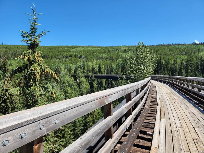 After our good deed we headed into yhe canyon. It was stunning. 16 trestle bridges, two tunnels, cliffs, gulches and apparently a bear that we missed. Most was in the shade too so it was very pleasant riding. Some interesting history too. After the railway closed, in the early 90s a group of volunteers restored the trestles and opened to section to the public. Less than 10 years later, most were destroyed by a forest fire. Luckily for us the BC government footed the bill to have them rebuilt. It must have been heartbreaking for the original volunteers though.