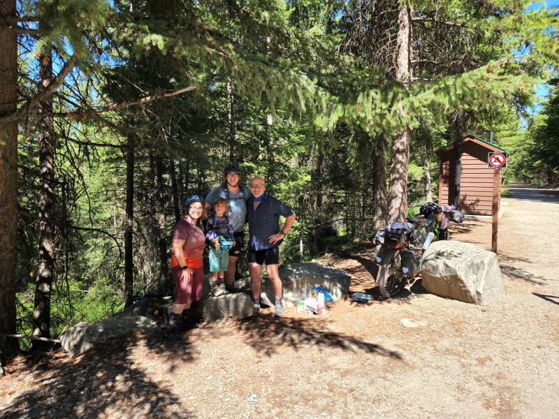 After the 12km traverse through the canyon up to a high point of 1280m ASL we stopped briefly to chat with our friends who we helped with kiddy seat. They fed us full strength Cokes so although we thought we'd stealth camp again sites were relatively sparse so we pushed through to a basic BC rec park on a lake. A stunning sunset finished a long but lovely day. Gordon is exhausted but enjoyed the day. A quiet one tomorrow.