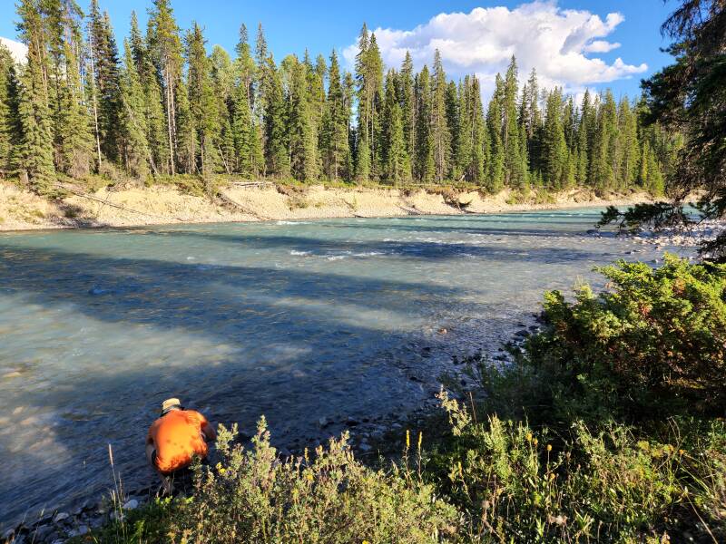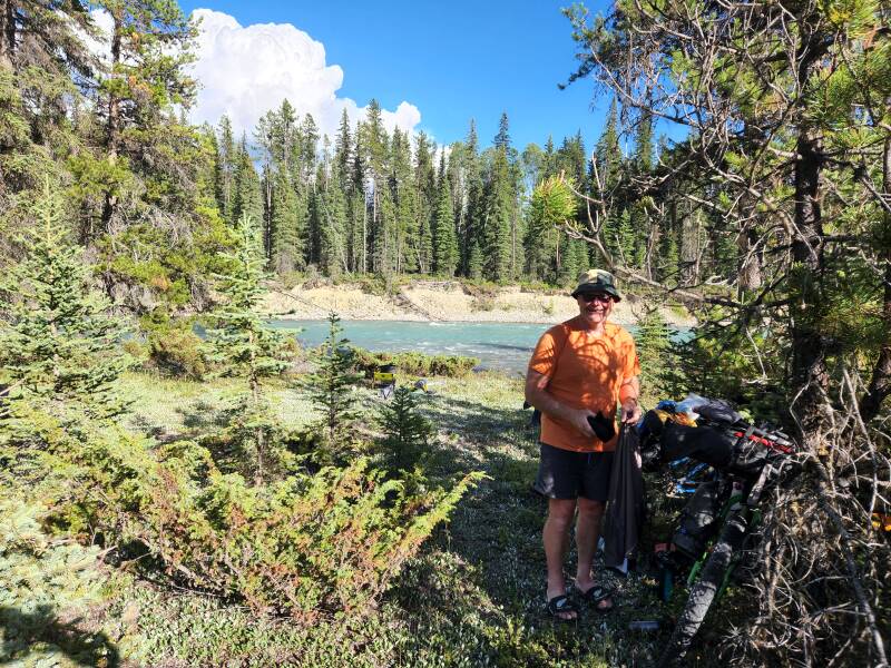 After about 40km we started looking for a campsite. We'd passed into Kootenay National Park at about 37km so knew it was going to be a bit tougher to find a good site. I'd spied a side road on the map so we decided to check it out. We snuck through a keep out gate and found ourselves in a quarry with a track exiting on the far side so we followed that down sensing it would come out at the river. Sure enough, we've landed in a beautiful spot right next to the river with plenty of tent possibilities and a place to hang the food well away from the tent. We don't go anywhere without our bear spray at the moment, not even the loo!